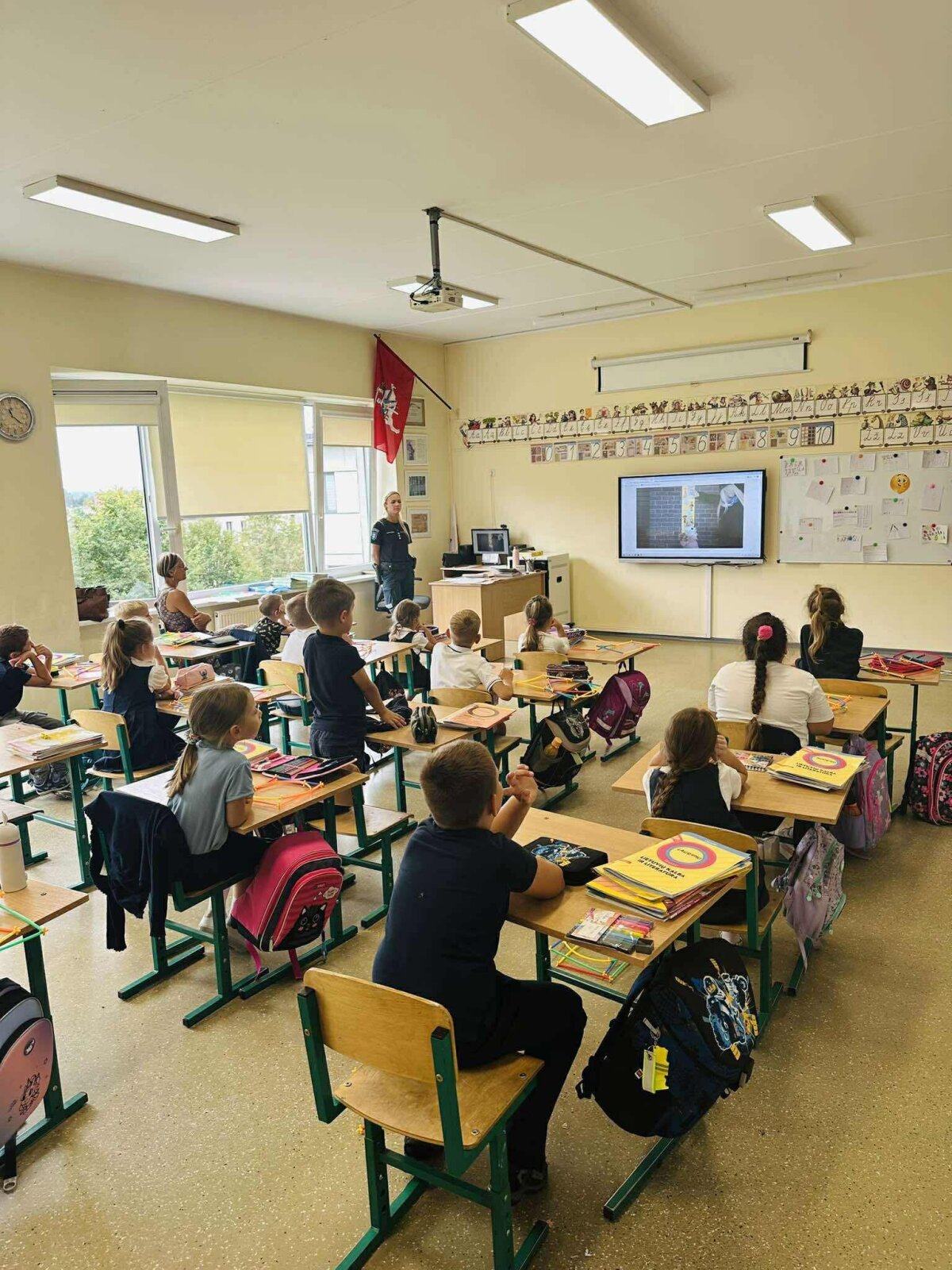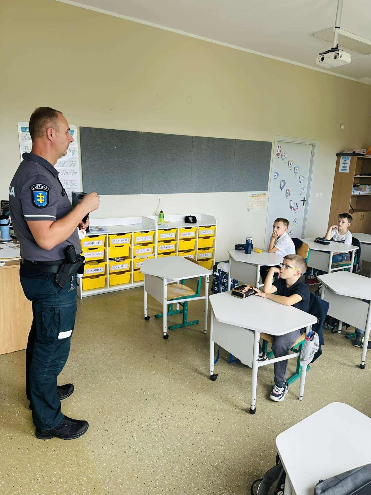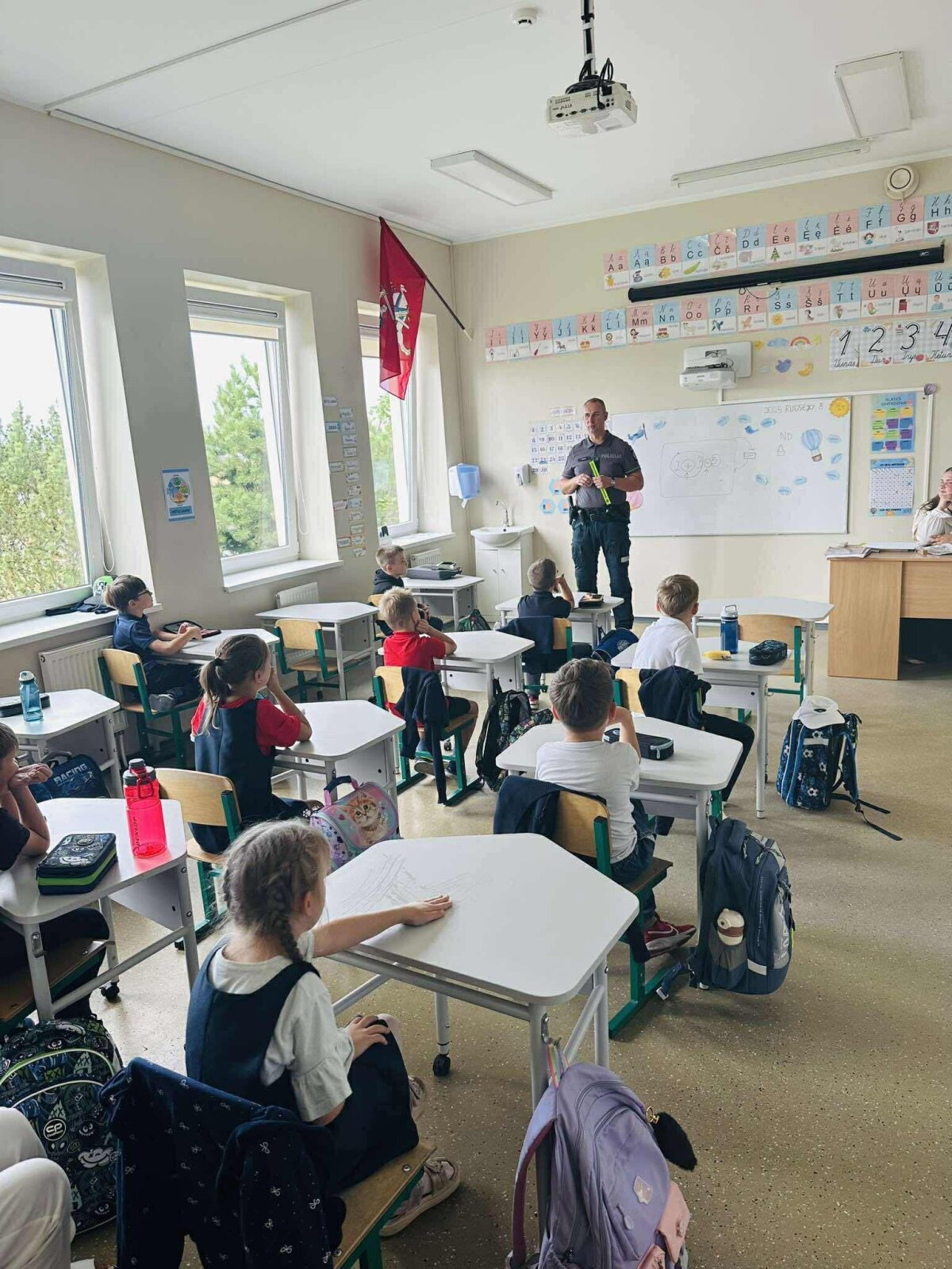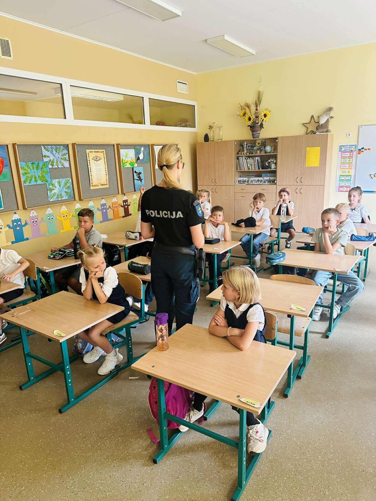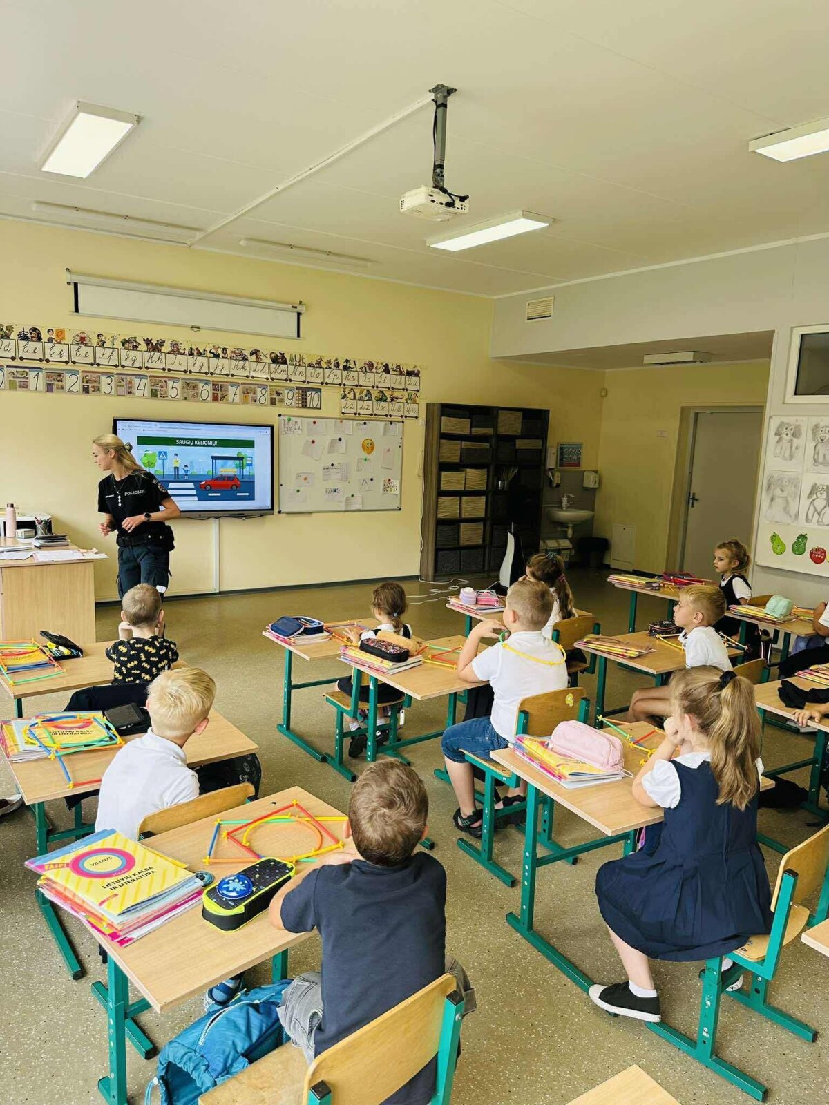 Rugsėjo 9 dieną mūsų mokykloje lankėsi bendruomenės pareigūnai, kurie pirmokams vedė pamoką „Saugiai į mokyklą, saugiai į namus“. Vaikai sužinojo, kaip taisyklingai pereiti gatvę, kodėl svarbu dėvėti atšvaitus ir kaip elgtis kelyje, kad kelionė į mokyklą ir namus būtų saugi.