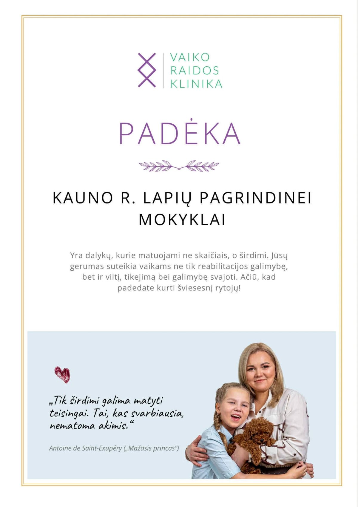 Netrukus po renginio sulaukėme padėkos iš Vaiko raidos klinikos, kurioje pažymėta, kad mūsų mokyklos indėlis virto realia pagalba trims vaikams, susiduriantiems su rimtais sveikatos iššūkiais. Klinika dėkojo už mūsų bendruomenės gerumą, šilumą ir prisidėjimą prie vilties ir šviesos istorijų kūrimo.