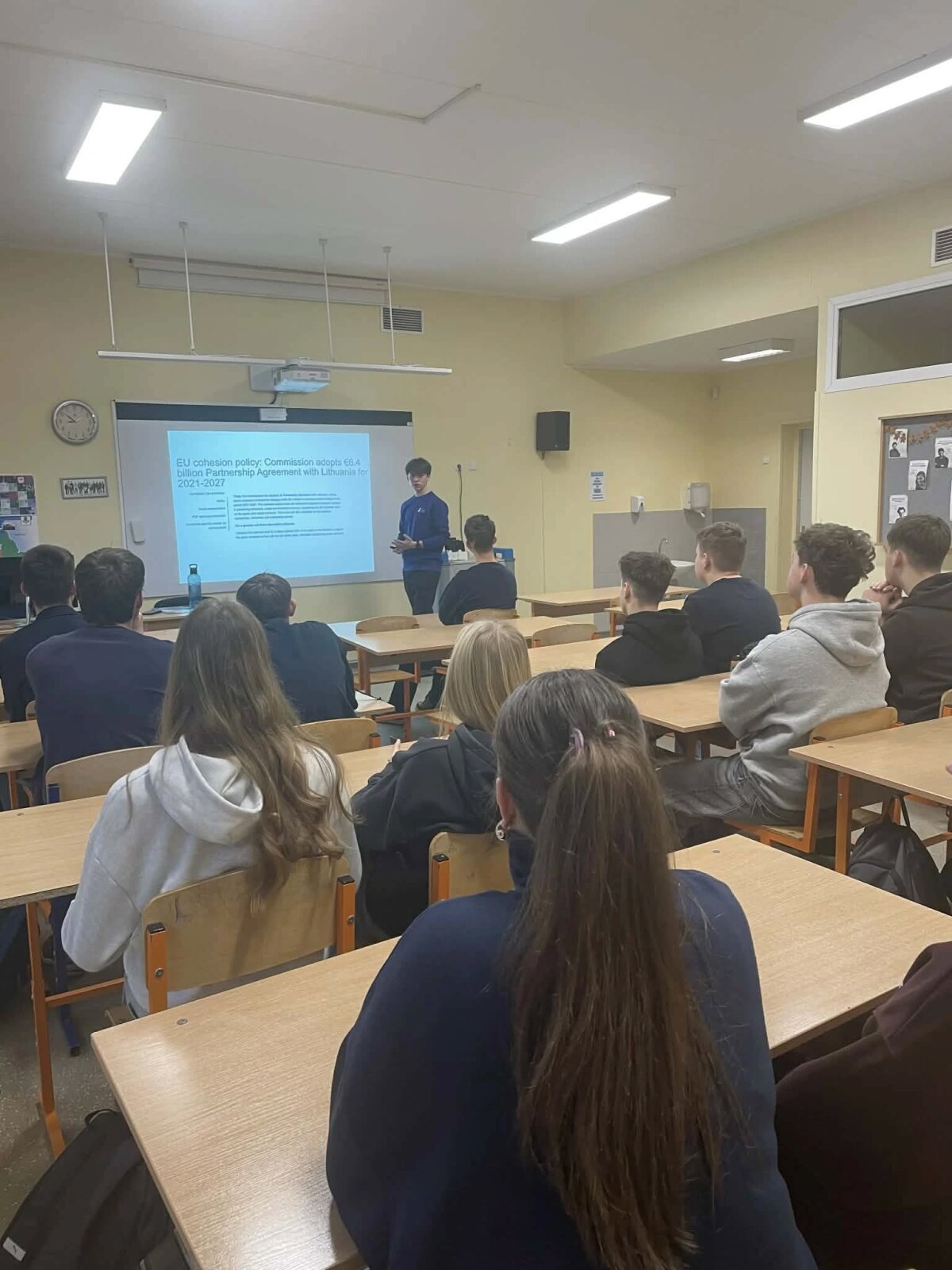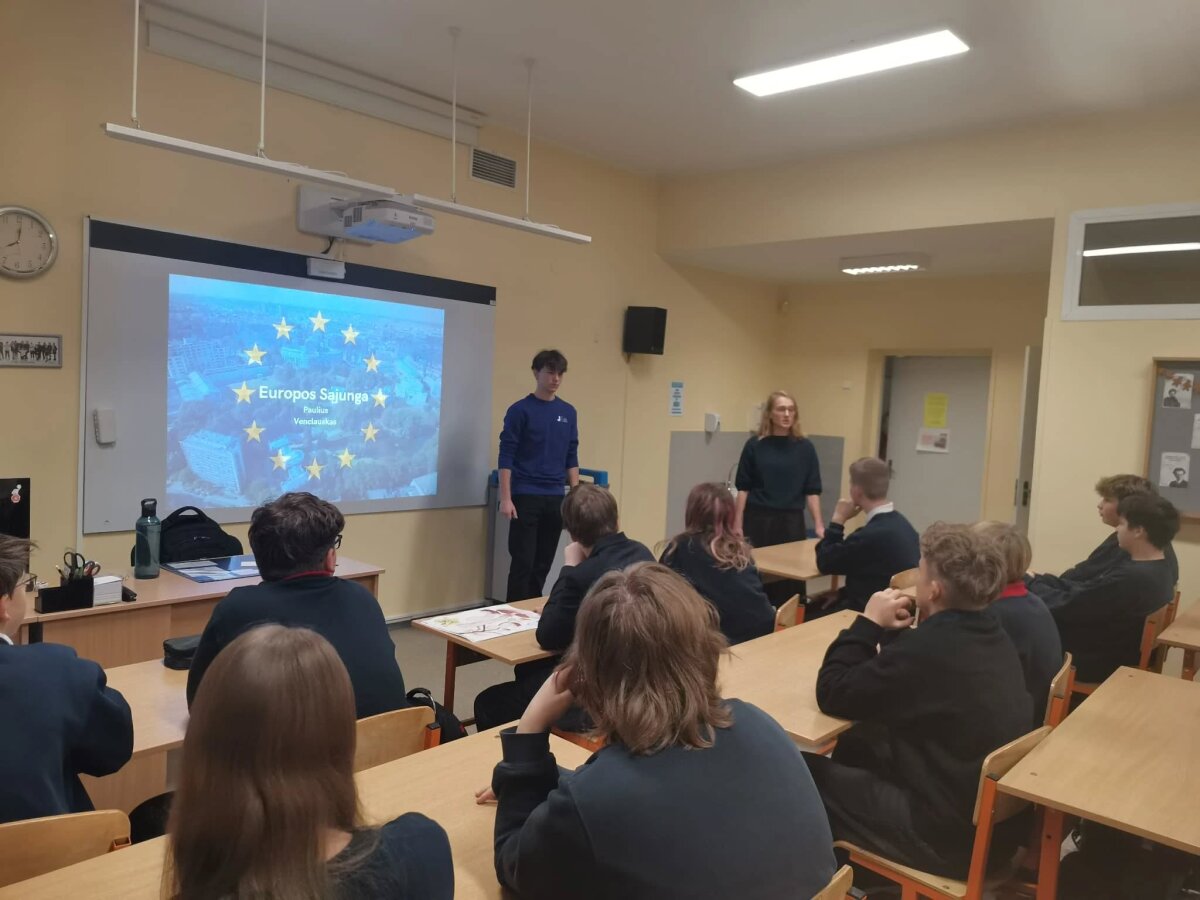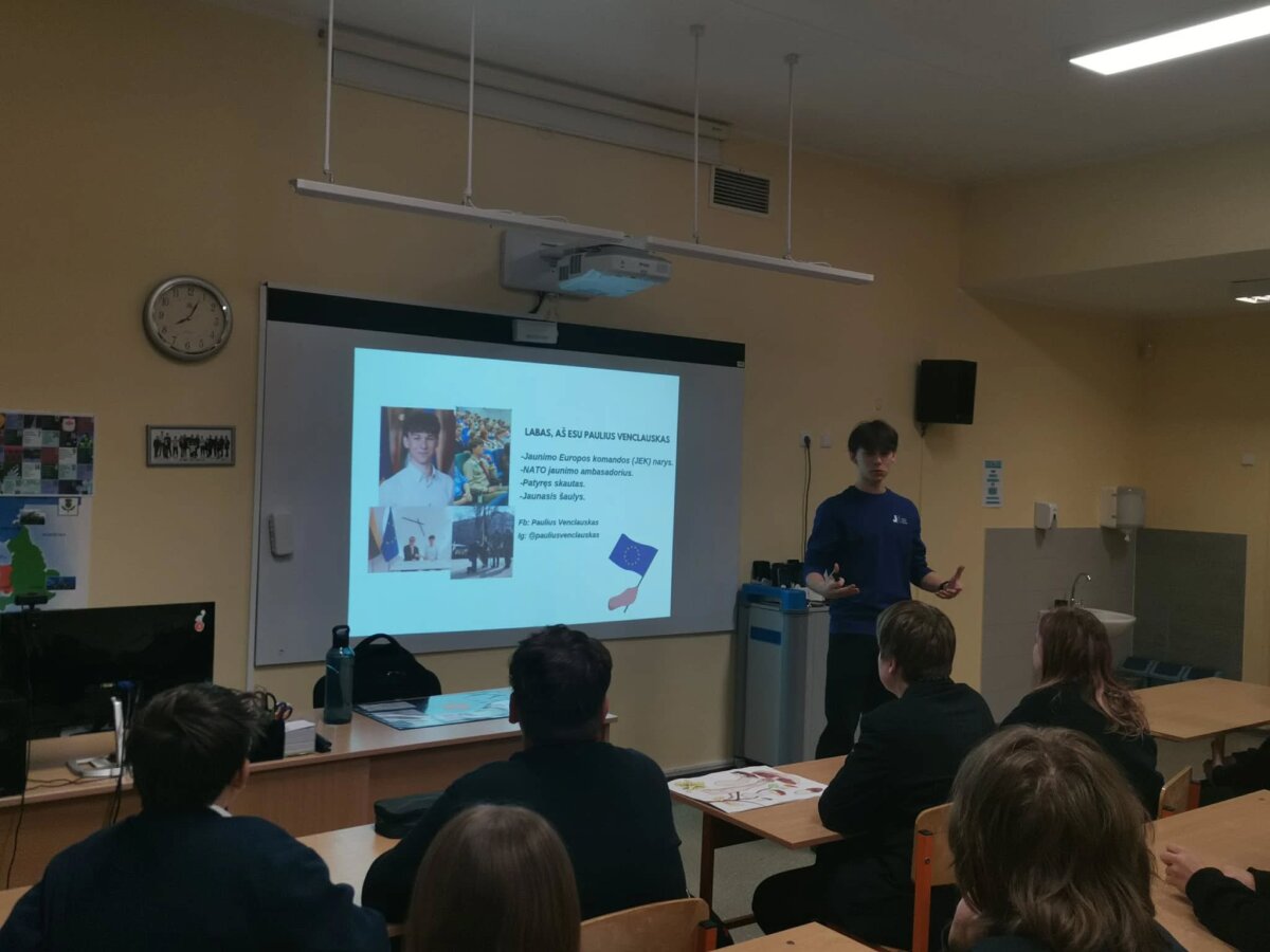 Paulius mokinius supažindino su Europos Sąjungos institucijomis, jų funkcijomis bei sprendimų priėmimo procesu. Taip pat buvo aptarta, kokią įtaką ES sprendimai daro Lietuvai ir kiekvieno piliečio kasdieniam gyvenimui.